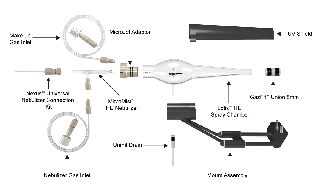 - A MicroJet Make-up gas adapter that provides high velocity sheathing gas that entrains and shapes the nebulizer aerosol plume to prevent cell deposition on the spray chamber walls